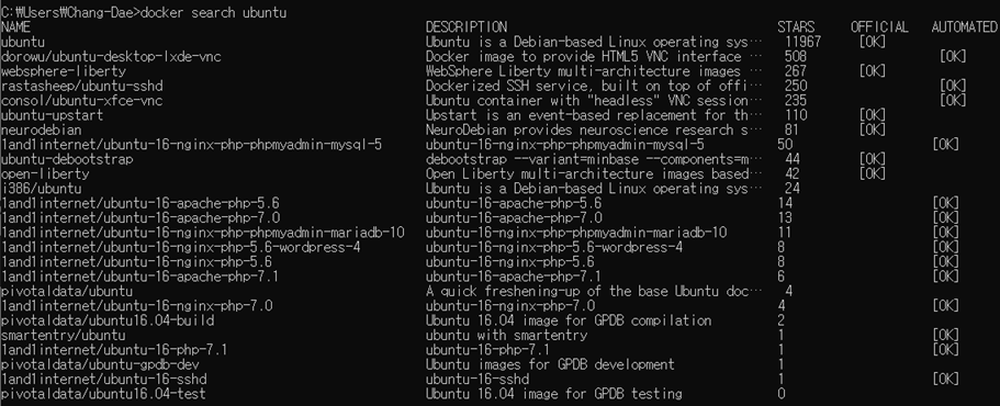 예를 들어 Dokcer의 ubuntu Image을 다운 받고 싶으면 ubuntu 검색을 통해 사용할 수 있습니다.
