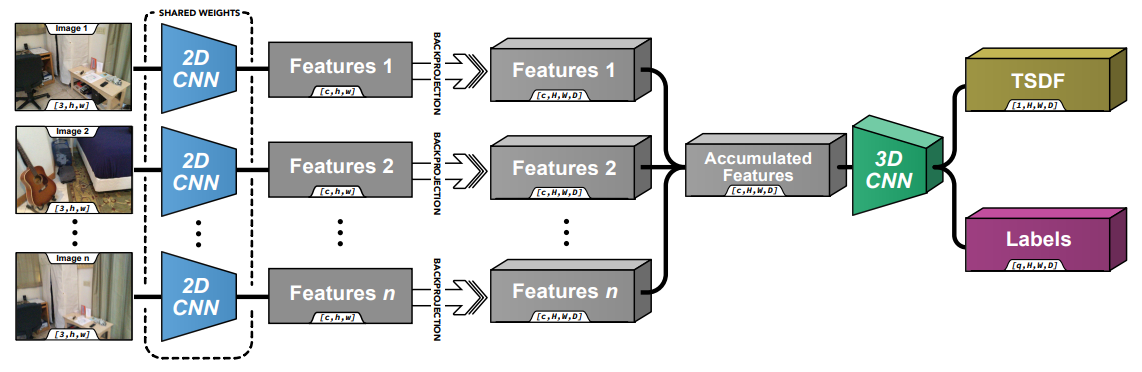 먼저, RGB Image에서 2D CNN을 통해 Features를 추출하고 이를 Back Project을 통해 3D Feature Volume을 생성한다. 이를 3D CNN을 통해 TSDF Volume으로 재생성한다.